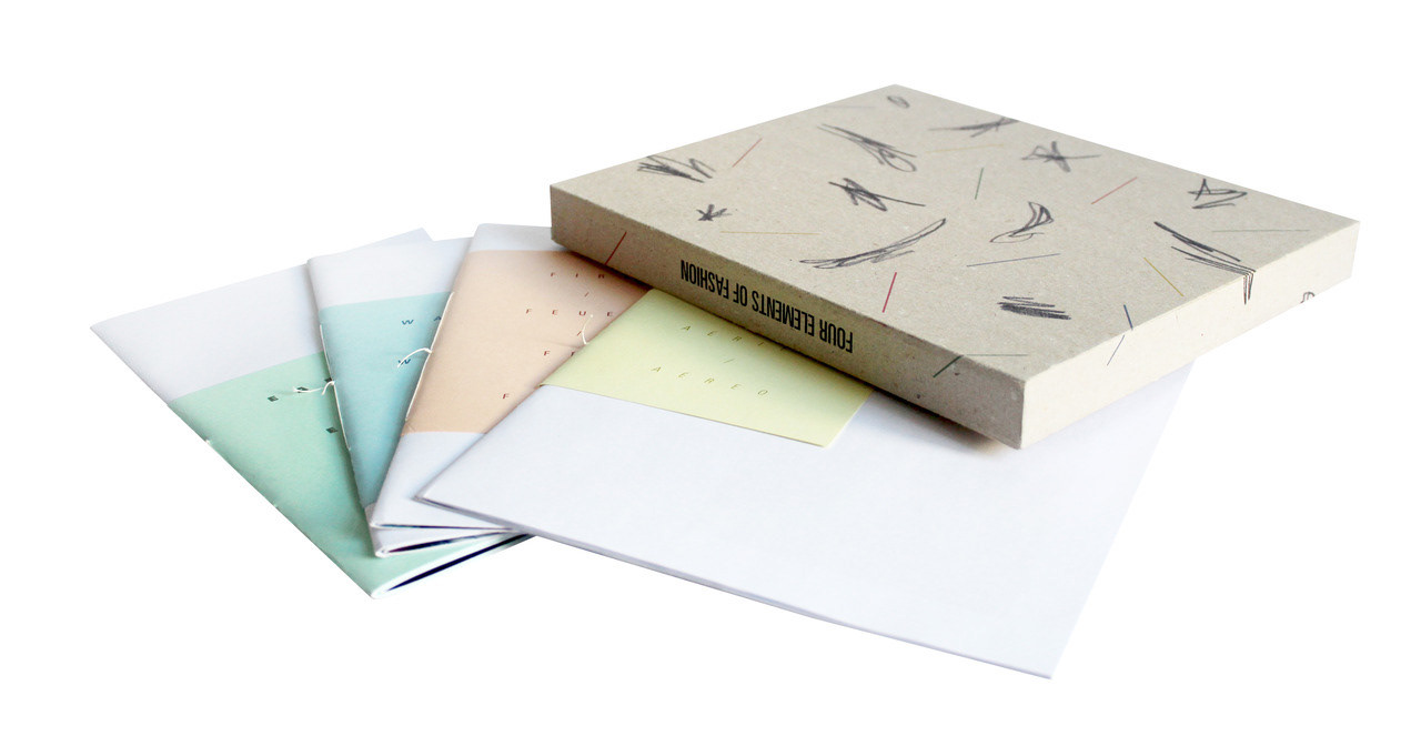 a shared project with Elen Nikoletos, 2015 graphic design diploma project: four books each themed around one element, relating fashion, photography, color, paperweight, typography and graphic style back to each element.