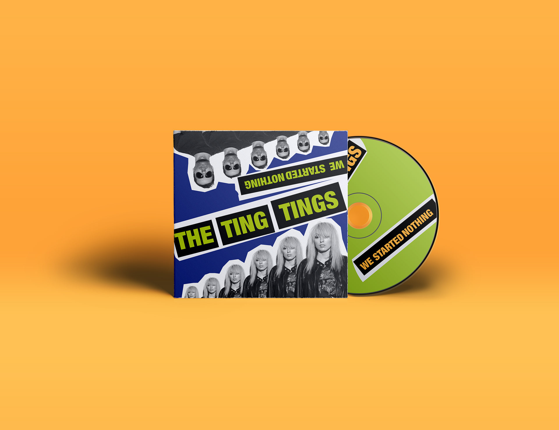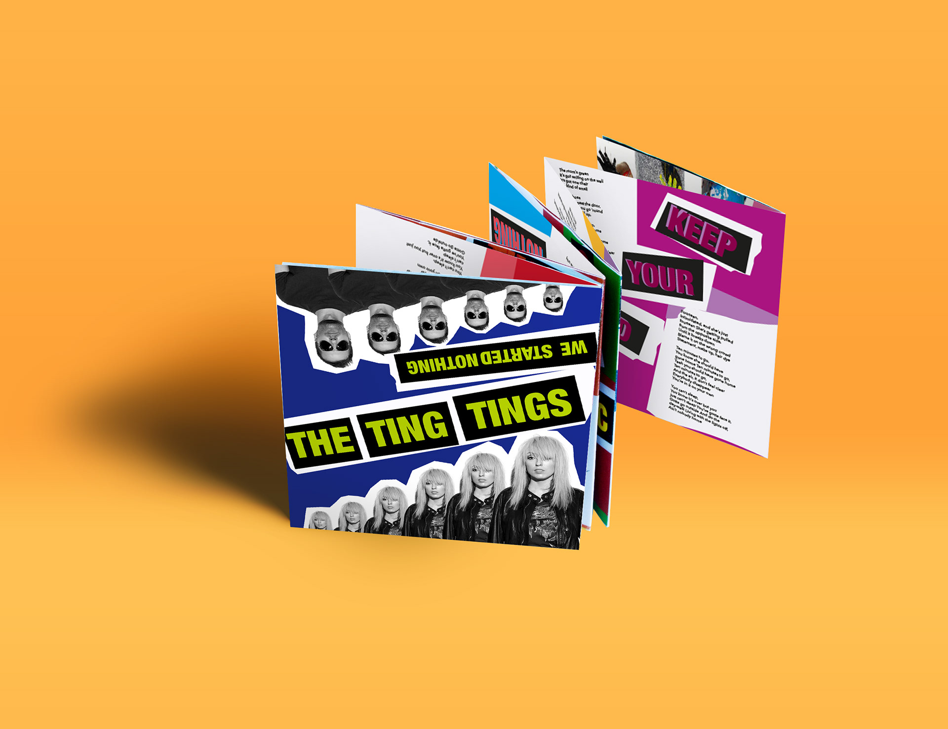 fictional project for the band the ting tings, 2018 design of a fictional CD cover, CD and an unfoldable booklet with poster design on the back.